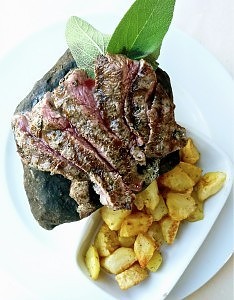 When cooked, arrange the meat after slicing it sideways (preferably 1 cm thick) on a hot slab and add sage or rosemary.