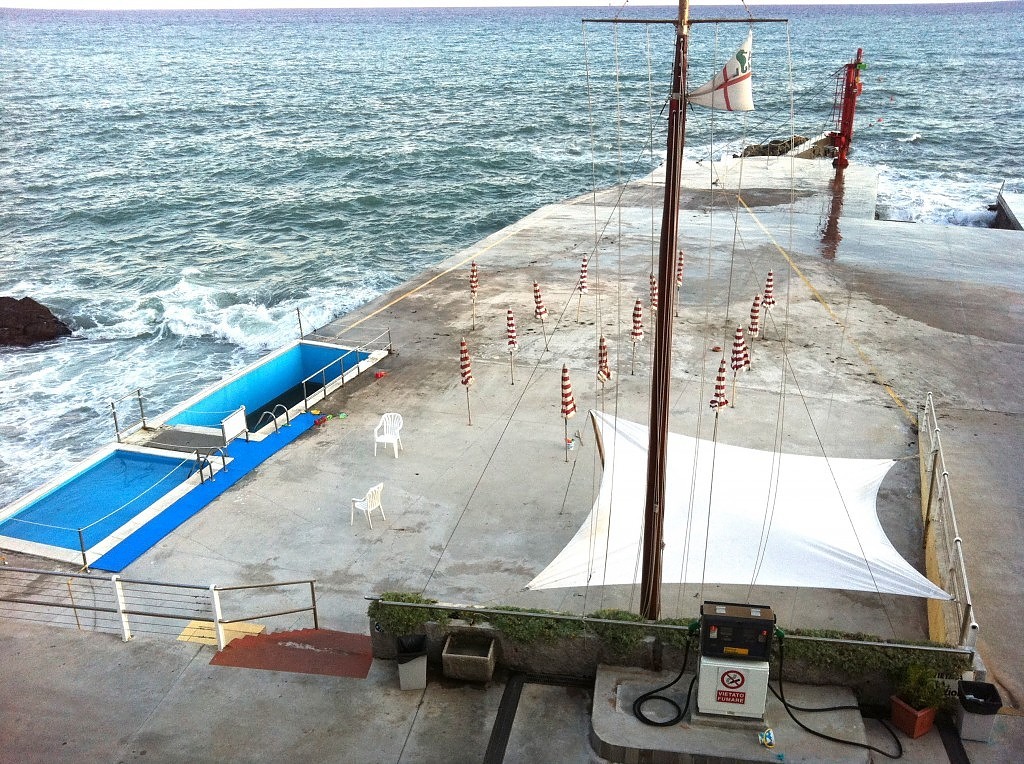 Mi interrogo su chi possa frequentare questo luogo che ho fotografato a Genova, prima di arrivare a Boccadasse. Una grande prua di cemento tra i flutti, gli ombrelloni a righe arancioni, due piscinotte semipiene. Non manca il distributore di benzina?!?!