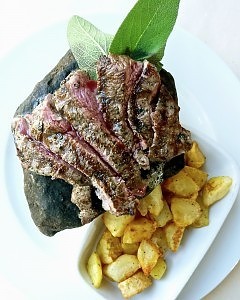 Presentazione: una volta cotta la carne tagliarla in senso obliquo (preferibilmente in fette di circa 1 cm), disporla su di una pietra scaldata in forno (precedentemente lavata) ed aggiungere un ciuffo di salvia o rosmarino.