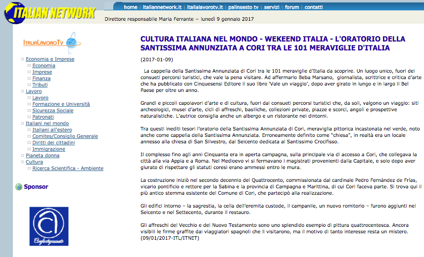 ITALIAN NETWOTK.IT – Cultura italiana nel mondo. Weekend Italia. L’Oratorio della Santissima Annunziata a Cori tra le 101 meraviglie d’Italia